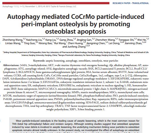 近期,伟德国际bevictor1946附属金陵医院、南京军区南京总医院骨科赵建宁教授带领的团队在人工关节无菌性松动机制研究方面取得重要发现。相关成果在线发表于《Autophagy》杂志上(影响因子11.753)。题目为:“Autophagy mediated CoCrMo particle-induced peri-implant osteolysis by promoting osteoblast apoptosis”。通讯作者为伟德国际bevictor1946附属金陵医院骨科主任赵建宁教授和bv1946伟德官网董磊、张峻峰教授,伟德国际bevictor1946博士研究生王振恒为文章的第一作者。在这篇文章中,研究人员证实人工关节长期使用后产生的CoCrMo磨损微粒可以通过自噬促进成骨细胞的凋亡,从而参与人工关节无菌性松动的发生,下调自噬可以抑制骨溶解。这项研究从一个全新的角度阐明了人工关节无菌性松动的新机制,为这类疾病的治疗干预提供了新的靶点。